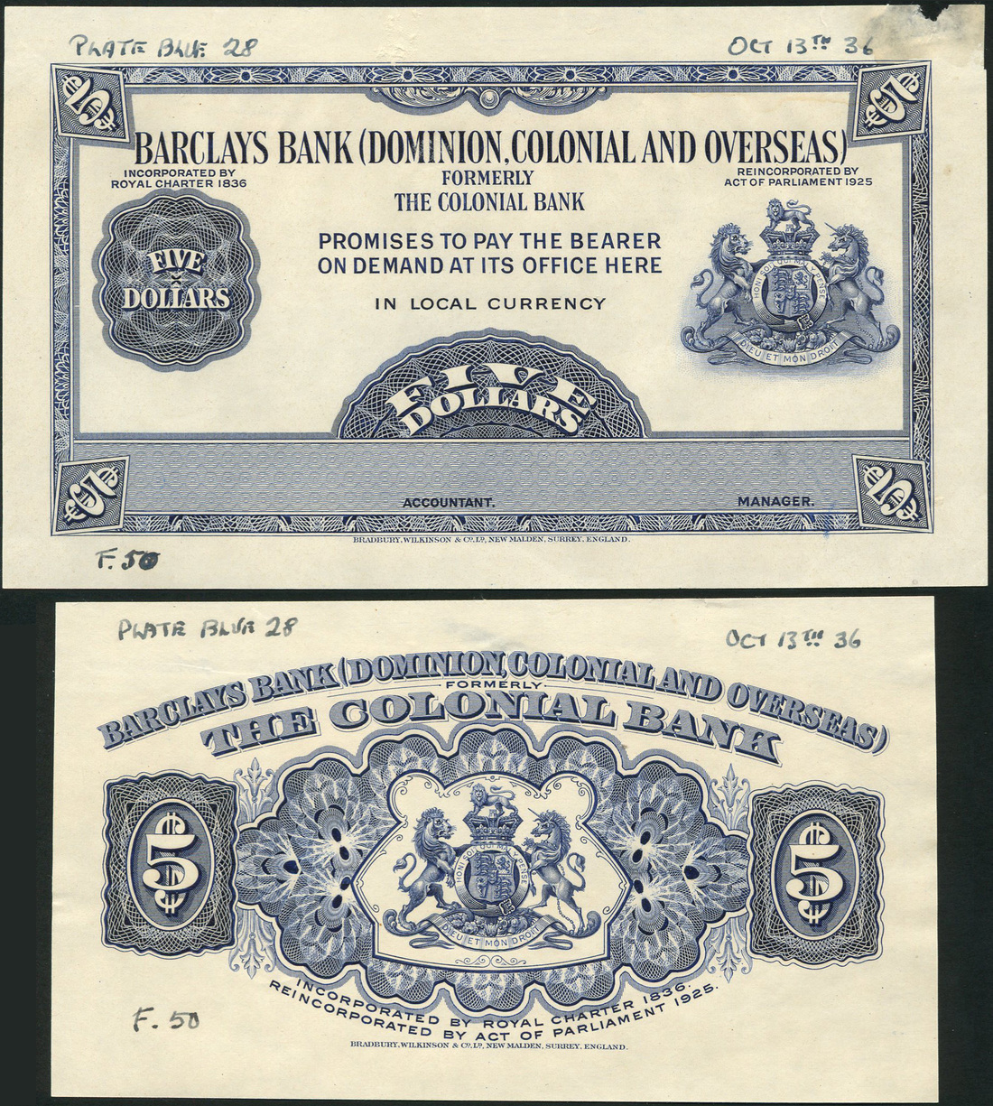 (†) Barclays Bank (Dominion, Colonial and Overseas), Barbados, printer's plate proofs (3) for $5 ND (1936) comprising, 1. Obverse die proof in blue and white, value in guilloche at left and in each corner, coat of arms at right; 2. Reverse die proof in blue and white, coat of arms at centre, value in guilloches at left and right; 3. Obverse uniface progressive proof, green, blue and multicoloured on sage-green and violet underprint, central patterned guilloche and underprint only