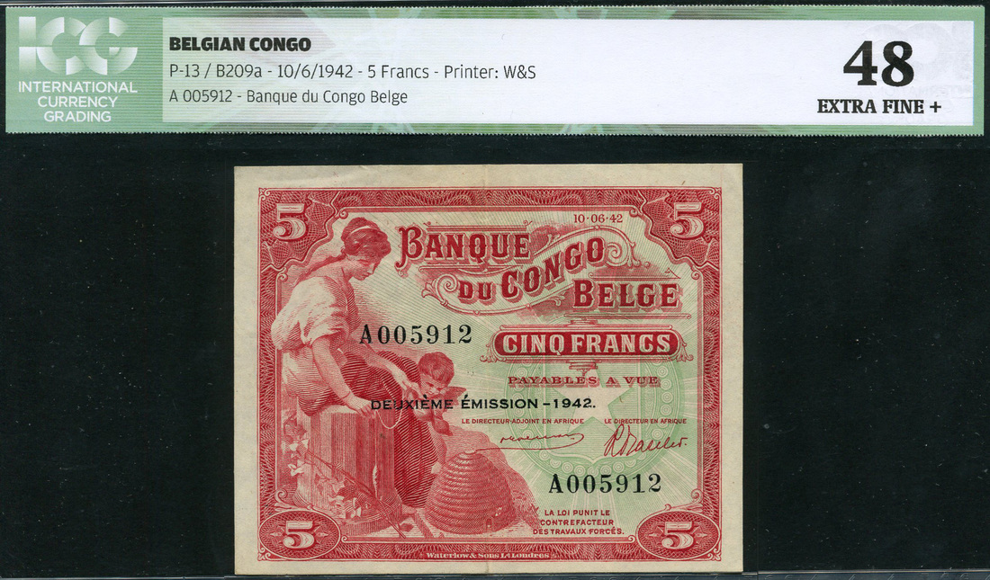 (x) Banque du Congo-Belge, 5 francs, 10 June 1942, DEUXIEME EMISSION, serial number A 005912, red and pale green, maiden, cherub and beehive (Industry) at left, star right centre, value at each corner, Goeman and Baseleer signatures, reverse red, elephant and hippo in circular frame at centre, value at left and right