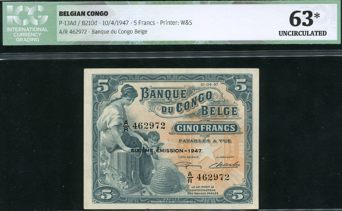(x) Banque du Congo-Belge, 5 francs, 10 April 1947, serial number A/R 462972, blue-grey, star in pale orange background at right, maiden and cherub at left with beehive (Industry), value at each corner, SIXIEME EMISSION-1947 black overprint in centre field, Guillaume and Charles signatures, reverse blue-grey, elephant at centre, value at left and right