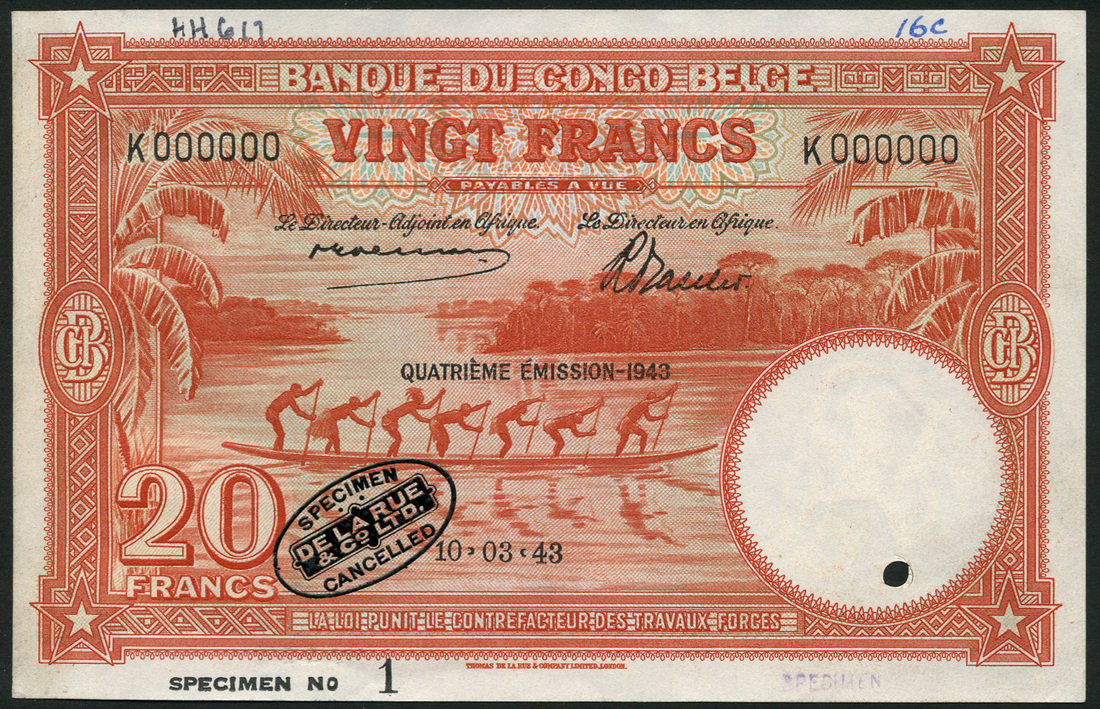 (†) Banque du Congo-Belge, specimen 20 francs, 10 March 1943, serial number K000000, orange on multicolour underprint, longboat with seven standing oarsmen at centre, reverse orange, logging with elephants at centre, one small cancellation hole and black De La Rue oval, small purple SPECIMEN handstamp at low right