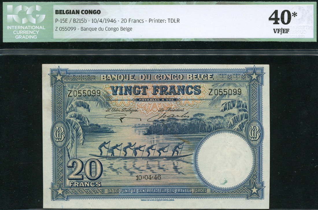 (x) Banque du Congo-Belge, 20 francs, 10 April 1946, serial number Z 055099, blue and pink-orange, canoe and seven Watusi oarsmen and canoe at centre, signatures of Guillaume and Charles, reverse blue and pink-orange, elephants logging at centre