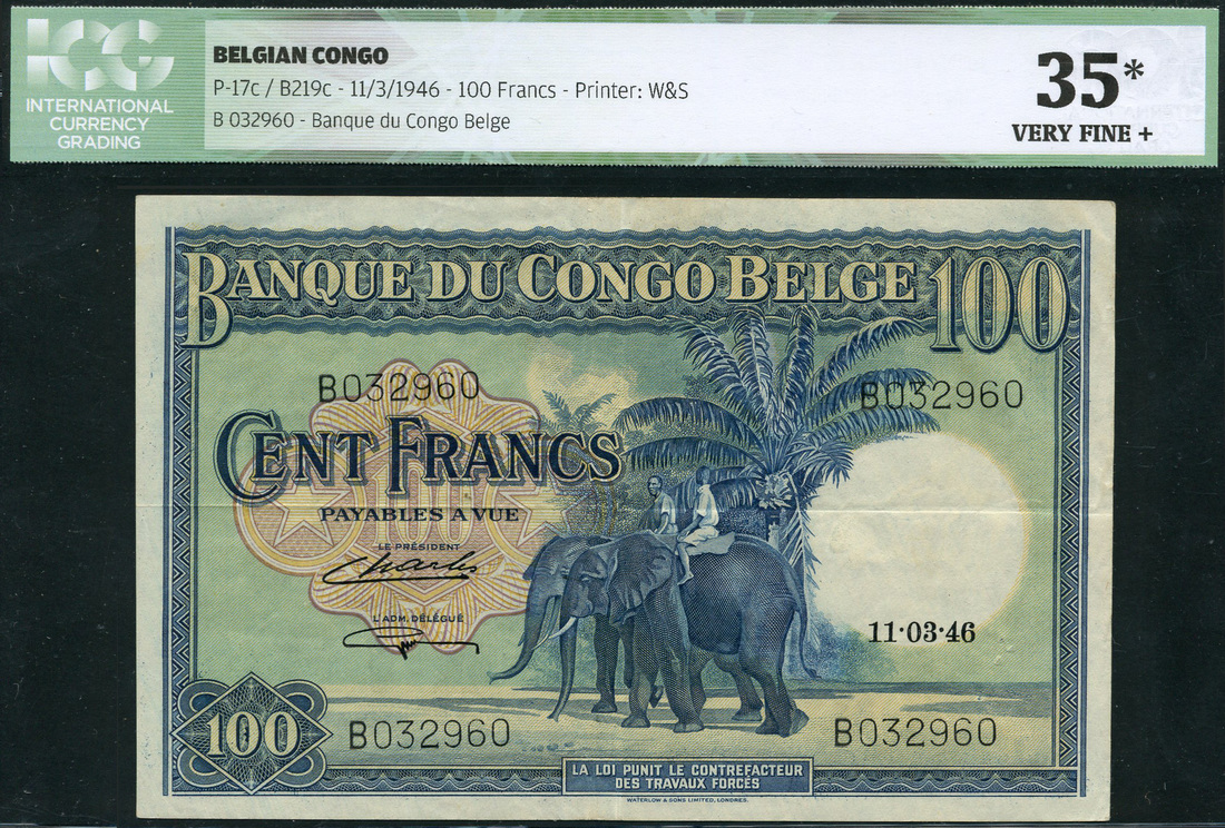 (x) Banque du Congo-Belge, 100 francs, 11 March 1946, serial number B 032960, blue, green and multicoloured, two elephants and palm trees at centre, value at left and at low left and top right, no EMISSISION overprint in field, Guillaume and Charles signatures, reverse blue, man and oxen