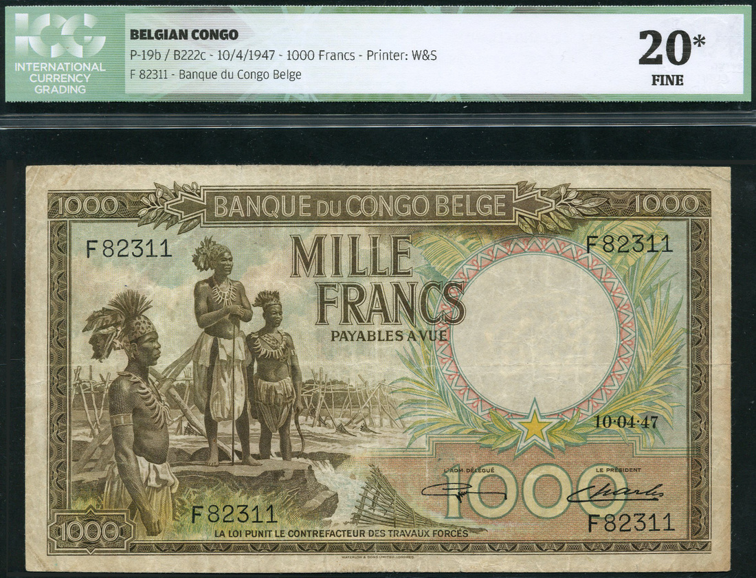 (x) Banque du Congo-Belge, 1000 francs, 10 April 1947, serial number F 82311, brown and multicoloured, three Warega tribesmen at left, star at right, Guillaume and Charles signatures, reverse brown and yellow green, youth at right, Warega musicians at left