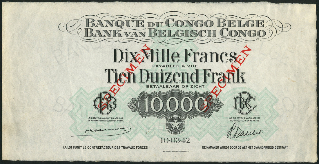 Banque du Congo-Belge, specimen 10,000 francs, 10 April 1942, no serial numbers, uniface, black on green underprint, value in tablet at low centre, star below, Goeman and Baseleer signatures, red SPECIMEN overprint
