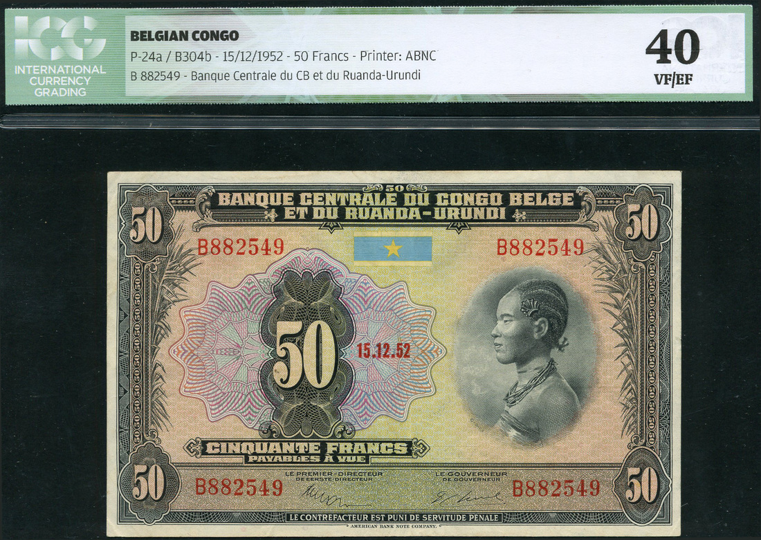 (x) Banque Centrale du Congo-Belge et du Ruanda-Urundi, 50 francs, 15 December 1952, serial number B 882549, black and multicoloured, girl at right, value in left field and at each corner, Martin and Charles signatures, reverse black, leopard at centre, value at left and right
