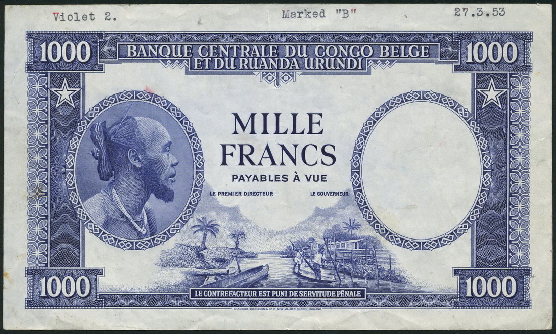 Banque Centrale du Congo-Belge et du Ruanda-Urundi, obverse die proof 1000 francs, ND (1953), blue print, Moliro man at right, ornate border, value in each corner, vignette of river scene centre at low centre