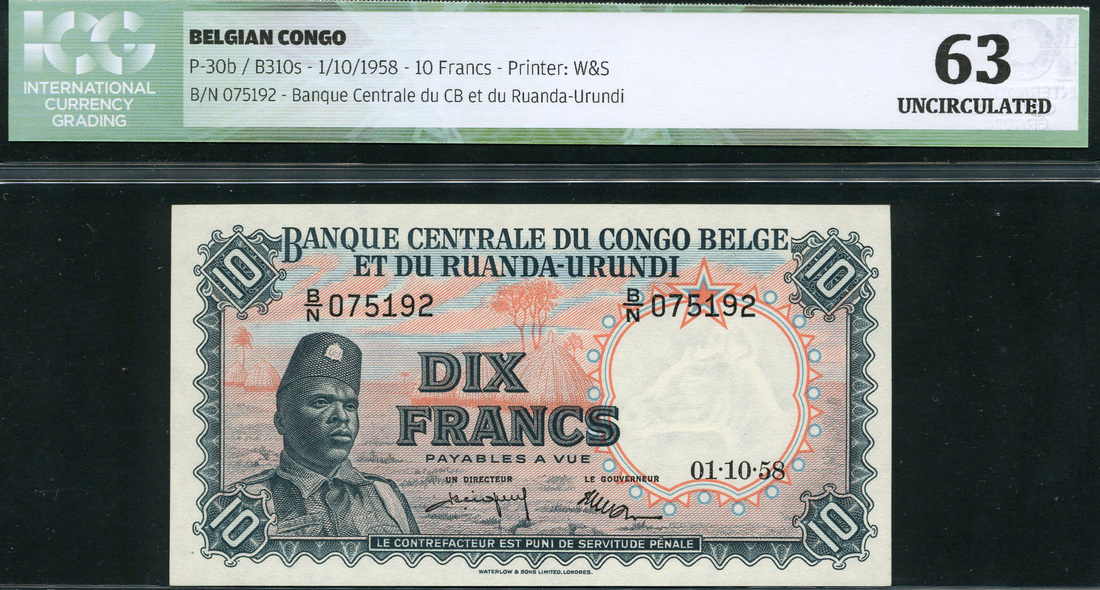 (x) Banque Centrale du Congo-Belge et du Ruanda-Urundi, 10 francs, 15 February 1955, serial number K 995484, blue-grey and pink, Congolese soldier at left, huts in background, Deraedt and Martin signatures, reverse blue-grey and pink, impala, also another example dated 1 October 1958, serial number B/N 075192, as previous but Perigneux and Martin signatures