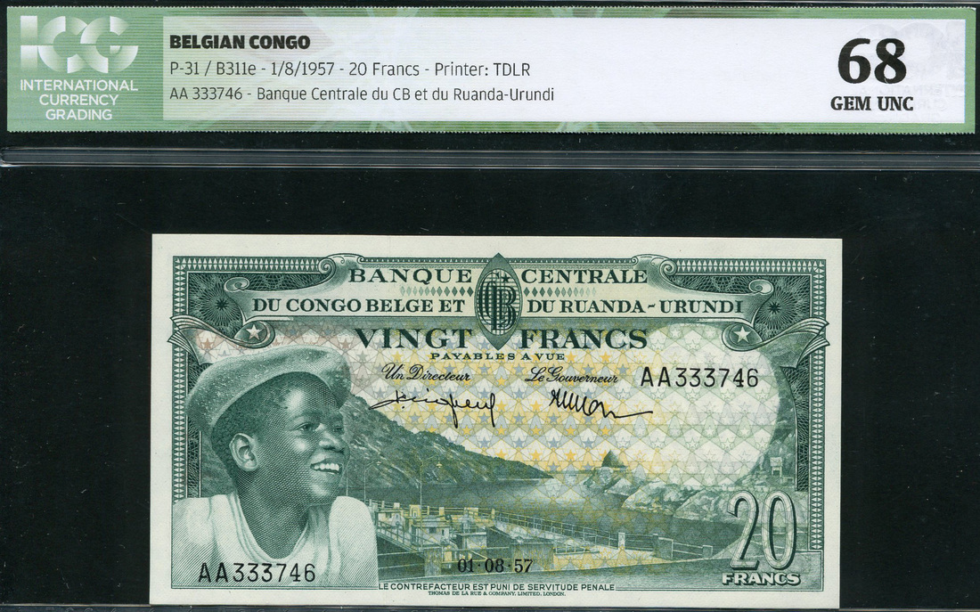 (x) Banque Centrale du Congo-Belge et du Ruanda-Urundi, 20 francs, 1 March 1957, serial number K 062468, green, also another example dated 1 August 1958, serial number AA 333746, both Perigneux and Martin signatures