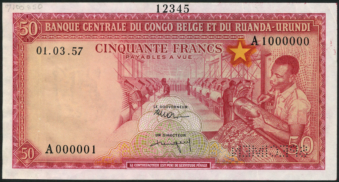(†) Banque Centrale du Congo-Belge et du Ruanda-Urundi, printer's archival specimen 50 Francs (2), 1 March 1957, serial number run A 000001 to A 1000000; 1 February 1959, serial number run S 000001 to S 1000000, both perforated SPECIMEN; also specimen 50 Francs, 1 March 1957, serial number A 000000, overprinted SPECIMEN in red diagonally on obverse and reverse, two punch holes, all red and multicoloured, workers in modern weaving factory, reverse village scene and man weaving by hand at left