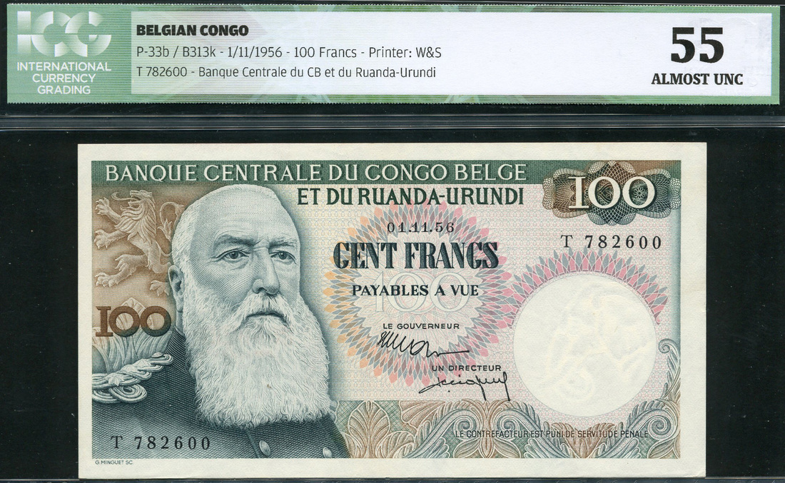 (x) Banque Centrale du Congo-Belge et du Ruanda-Urundi, 100 francs, 1 November 1956, serial number T 782600, dark green and multicoloured, King Leopold II at left, Perigneux and Martin signatures, reverse grey-blue and brown, basket weaving at centre, star top right