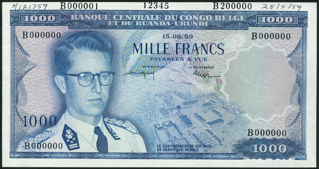 (†) Banque Centrale du Congo-Belge et du Ruanda-Urundi, printer's colour proof 1000 Francs, ND (1959), no serial numbers, no signatures; also printer's archival specimen 1000 Francs, 15 August 1959, serial number run B 000001 to B 200000 both blue and multicoloured, portrait of King Baudouin at left, aerial view, reverse African village huts and palm trees, the first perforated SPECIMEN