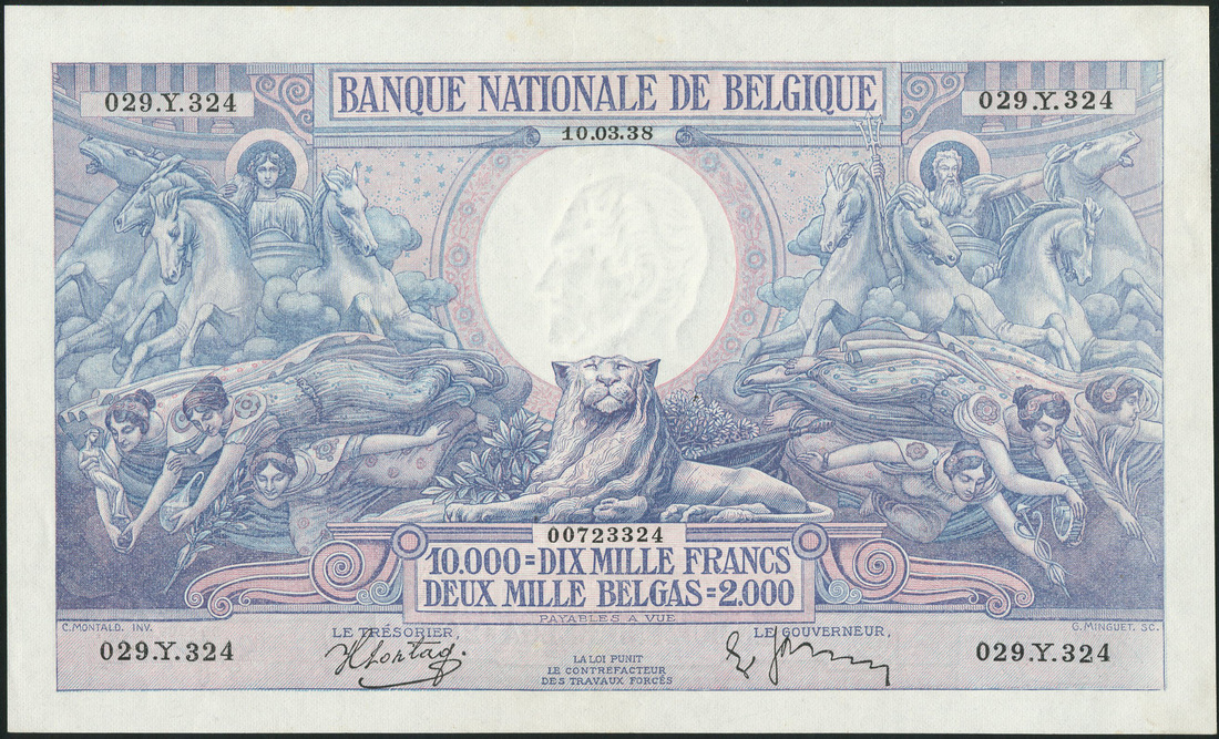 Banque Nationale, Belgium, 10,000 francs = 2,000 belgas, 10 March 1938, serial number 029.Y.324, blue and mauve, quadrigas driven by Ceres and Neptune at left and right, lion at centre, reverse, allegorical figures