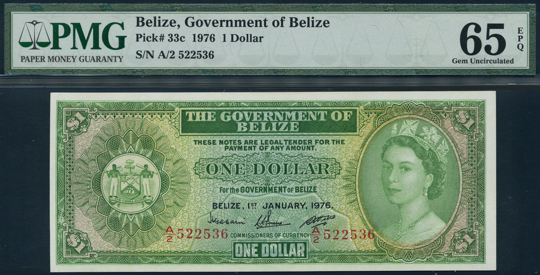 Government of Belize, $1, 1 January 1976, serial number A/2 522536, green on multicolour underprint, portrait Queen Elizabeth II at right, arms in ornate tablet at left, reverse, green and brown guilloche pattern