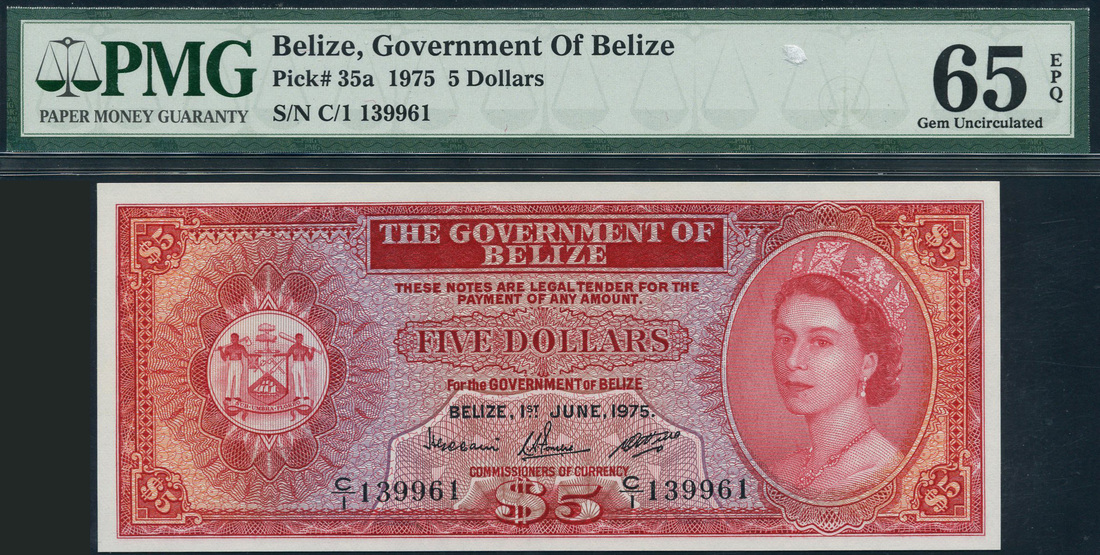 (x) Government of Belize, $5, 1 June 1975, serial number C/1 139961, red on orange and purple, arms at left, Elizabeth II at right, reverse, guilloche pattern,