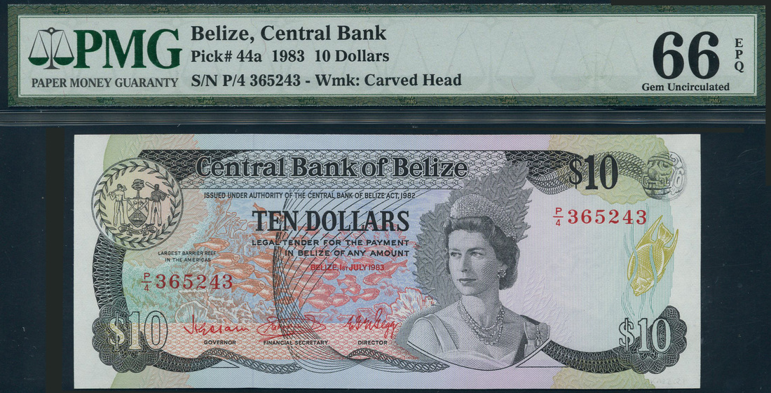 (x) Central Bank of Belize, $10, 1 July 1983, serial number P/4 365243, black on multicolour, $20, 1 July 1983, serial number T/3 761871, orange and brown on multicolour, Elizabeth II at right