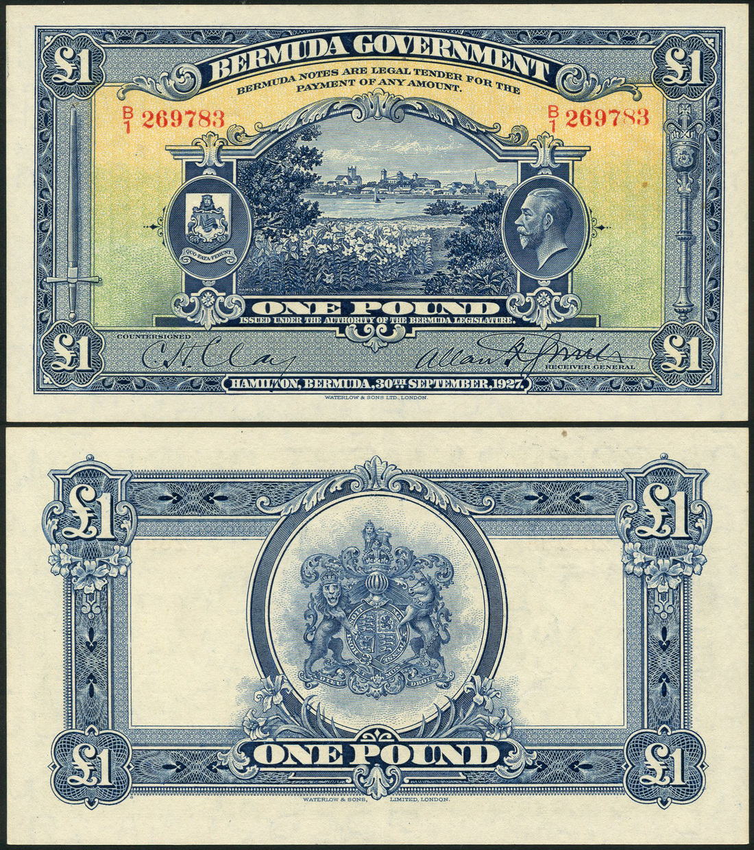 (x) Bermuda Government, £1, 30 September 1927, red serial number B/1 269783, blue and pale green and yellow, a view of Hamilton harbour from Crow's Lane at centre, head of George V at right, the Crest of Bermuda at left, value at each corner, printed signature of C.H.Clay at low left, of the Receiver General Allan F.Smith low right, reverse blue and white, arms at centre, value at left and right