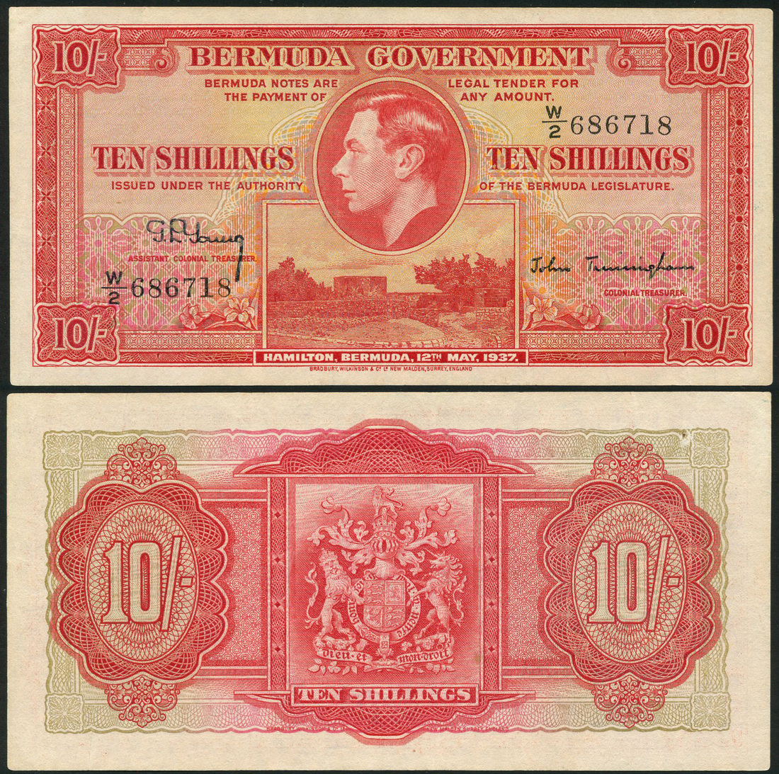 (x) Bermuda Government, 10 shillings, 12 May 1937, serial number W/2 686718, red, George VI at centre, Gate's Fort below, Young and Trimmingham signatures
