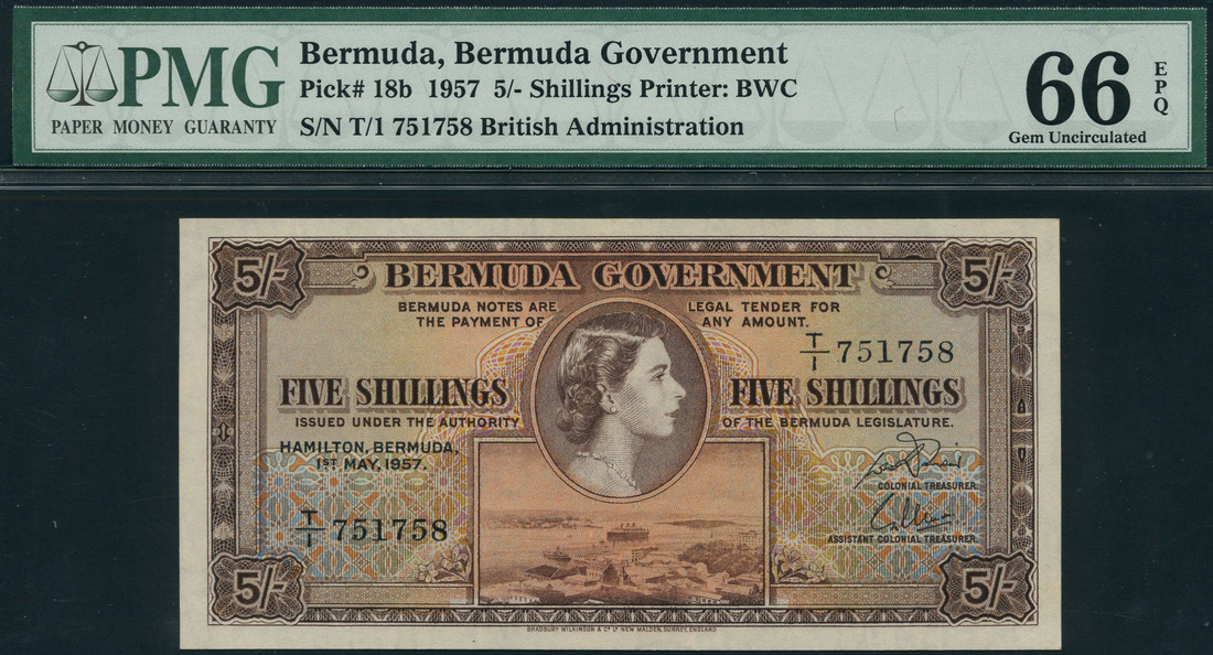Bermuda Government, 5 shillings, 1 May 1957, serial number T/1 751758, brown on multicolour underprint, portrait Queen Elizabeth II at centre, value in each corner, view of Hamilton Harbour low centre, reverse, brown, lilac and green, arms at centre flanked by value in ornate tablets