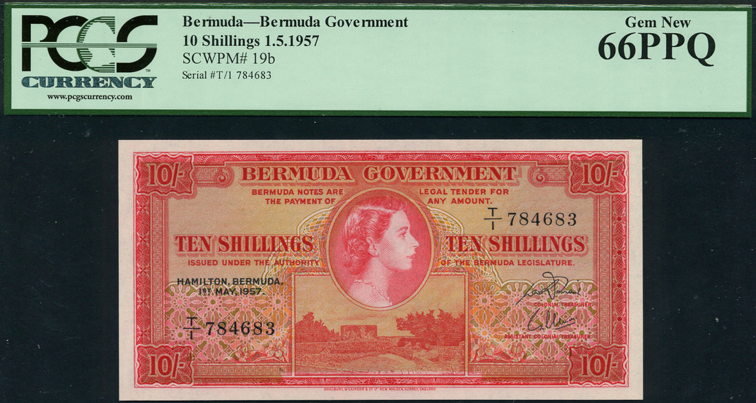(x) Bermuda Government, 10 shillings (5), 1 May 1957, consecutive serial numbers T/1 784683/4/5/6/7, red on light orange underprint, portrait Queen Elizabeth II in circular frame at centre flanked by value in text, Gate's Fort in St George low centre, reverse, Royal crest at centre