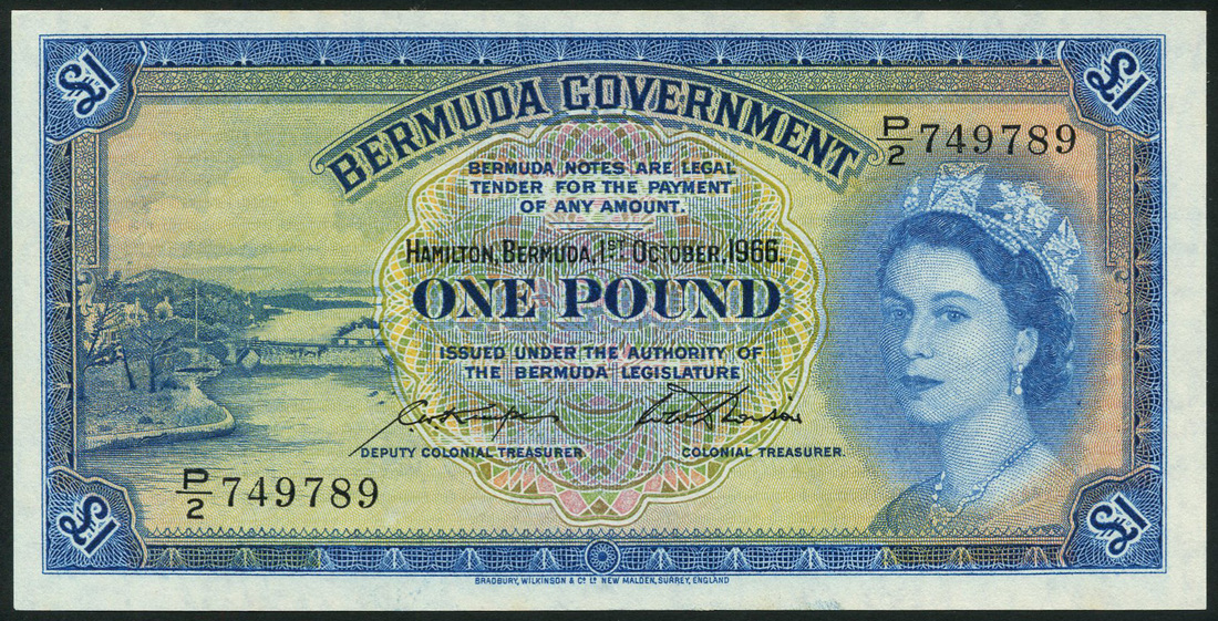 Bermuda Government, £1, 1 October 1966, serial number P/2 749789, blue and multicoloured, Elizabeth II at right, Somerset Bridge at left, Kempe and Davidson signatures, reverse blue, arms at centre, value at left and right