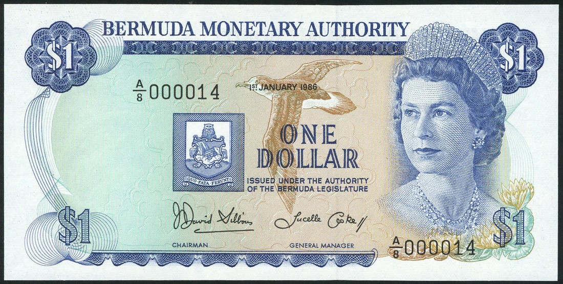 (x) Bermuda Monetary Authority, $1, 1 January 1986, serial number A/8 000014, blue on brown and green, Queen Elizabeth II at right, petrel bird in background, reverse blue, sailboats