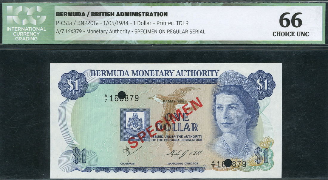 (x) Bermuda Monetary Authority, specimen $1, 1 May 1984, serial number A/7 16X879, blue on multicolour, $20, 1 May 1984, serial number A/2 73X737, green on multicolour, both with Elizabeth II at right, Gibbons and Fleet signature, red SPECIMEN overprint, hole punched
