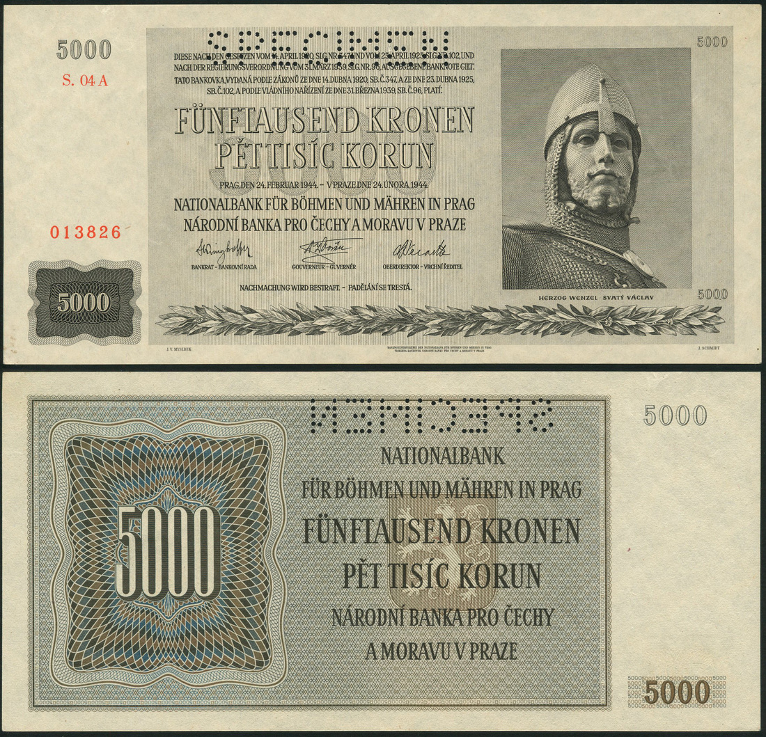 (x) Bohemia & Moravia, specimen 5000, 1944, serial number S. 04 013826, grey, Saint Wenceslas at right