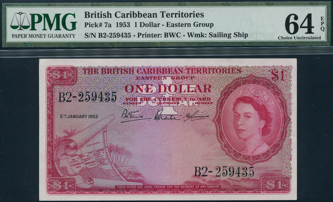 (TBB B107, Pick 7a), in PMG holder number 64 EPQ, choice uncirculated, Very rare first date with ship watermark and incredibly difficult to find in this grade, certainly missing from most advanced QEII collections in this state of preservation
