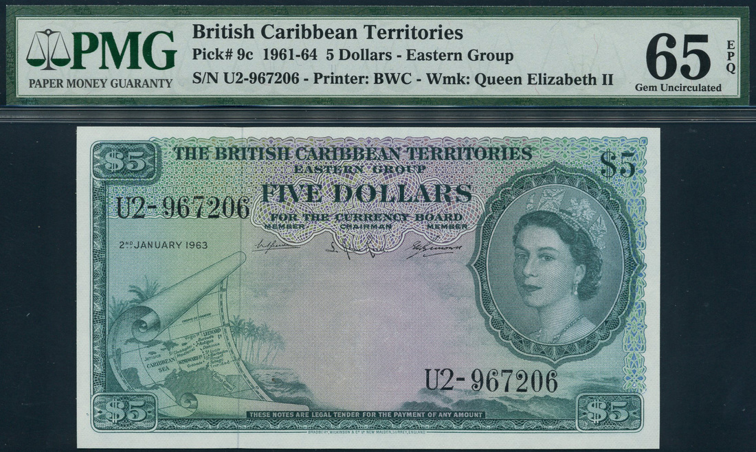 British Caribbean Territories, $5, 2 January 1963, serial number U2-967206, green on pale lilac, portrait Queen Elizabeth II in ornate circular frame at right, map of islands at low left, value in each corner and top centre, reverse, coats of arms of islands