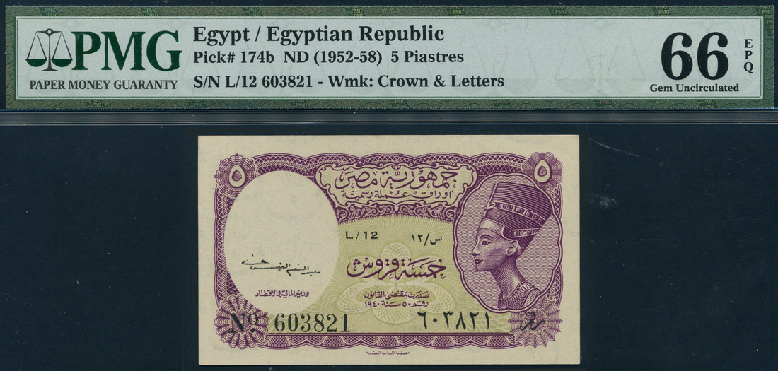 (x) Egyptian Republic Currency Note, 5 piastres, ND (1952), serial number L/12 603821, purple on pale green underprint, Queen Nefertiti at right, value at top left and right, reverse brown on tan, Abdul Mounem El Kaissouni signature variety