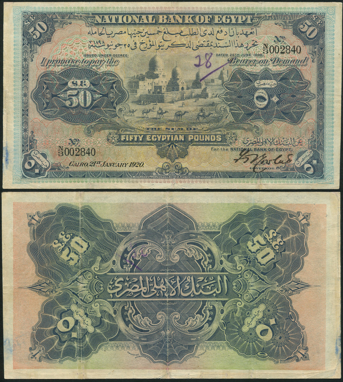 (x) National Bank of Egypt, £50, 21 January 1920, serial number N/S 3002840, purple and multicoloured, caravan train and Mameluke tombs at centre, value at each corner, Rowlatt signature, reverse purple and green, value at each corner