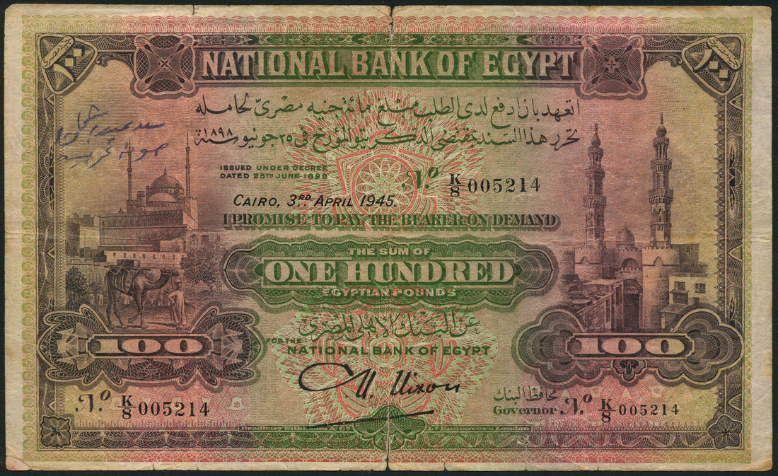 National Bank of Egypt, 100 pounds, 3 April 1945, serial number K/8 005124, dark purple on red and green underprint, Citadel and camel at left, mosque at right, value at centre and corners, Nixon signature