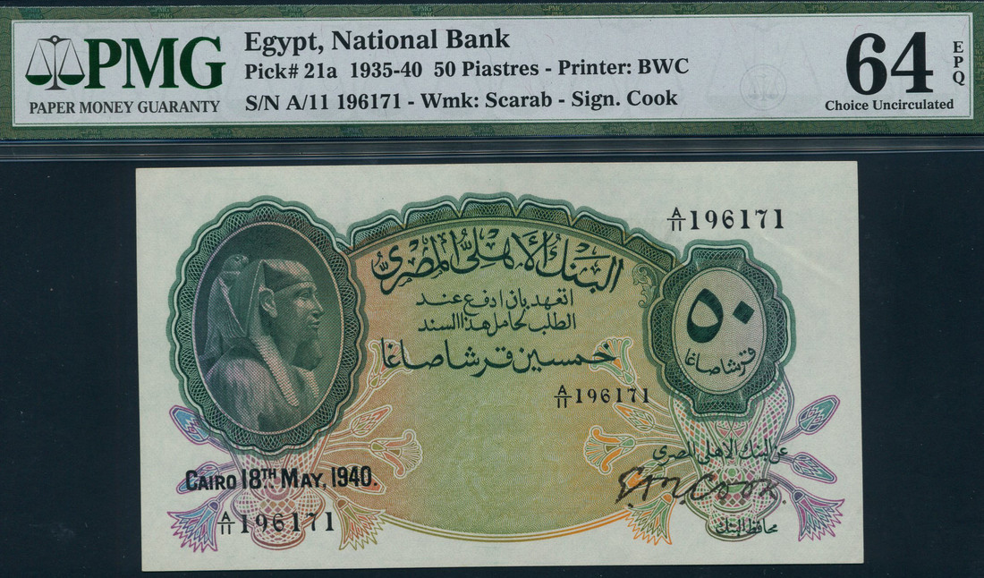 (x) National Bank of Egypt, 50 piastres (57), 7 May 1935-18 May 1951, all prefixes here except three (A/2,A/27/A/53 missing), green, lilac and white, King Chephren at left, lotus and Papyrus (Upper and Lower Egypt), value at right, signatures of Cook (11), Nixon (19), Leith-Ross (23) and Saad (4), reverse blue and white, arms at left, value at right