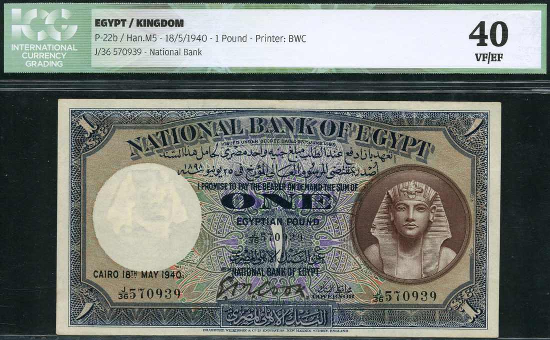 National Bank of Egypt, £1, 18 may 1940, serial number J/36 570939, blue, beige, green and lilac, Tutankhamen at right, value at centre and at each corner, Cook signature, reverse green, minaret at centre