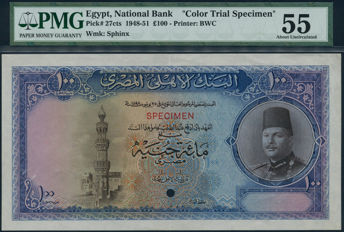 (x) National Bank of Egypt, colour trial £100, ND (1948), no serial number blue and multicoloured, the Mosque of Qadi Yahya Zein al-Din at left, King Farouk at right, reverse blue, reverse tomb of Sultan al-Ashraf Qatbay at the Qarafa cemetery of the Mamluks, red SPECIMEN overprint, hole punched