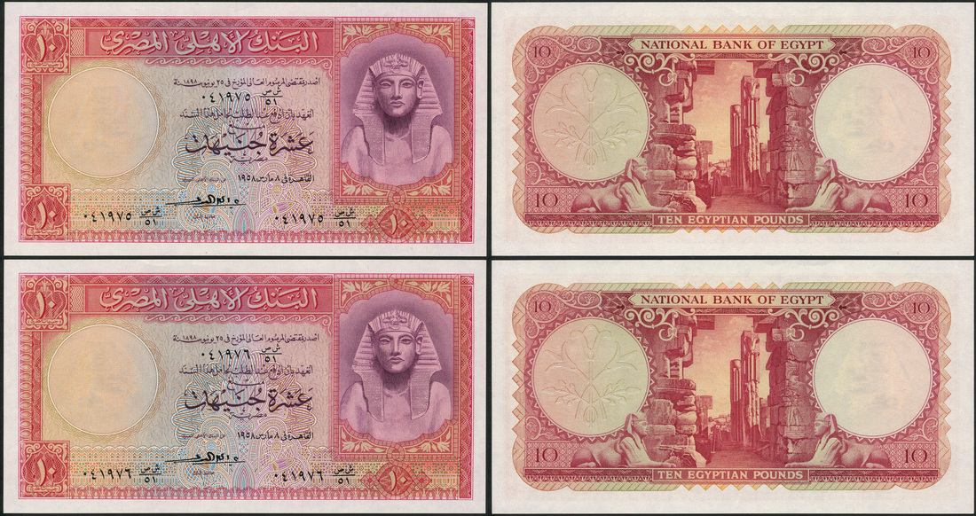 (x) National Bank of Egypt, £10 (2), 1958, red and lilac, Tutankhamen at right