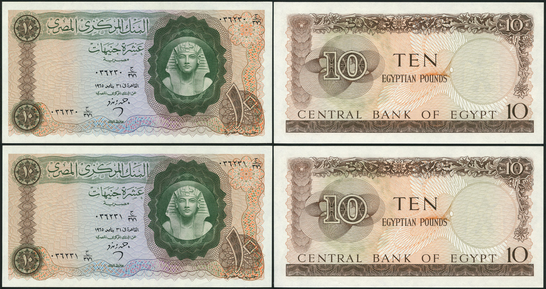 (x) National Bank of Egypt, £10 (2), 1965, consecutive serial numbers, green, Tutankhamen at right