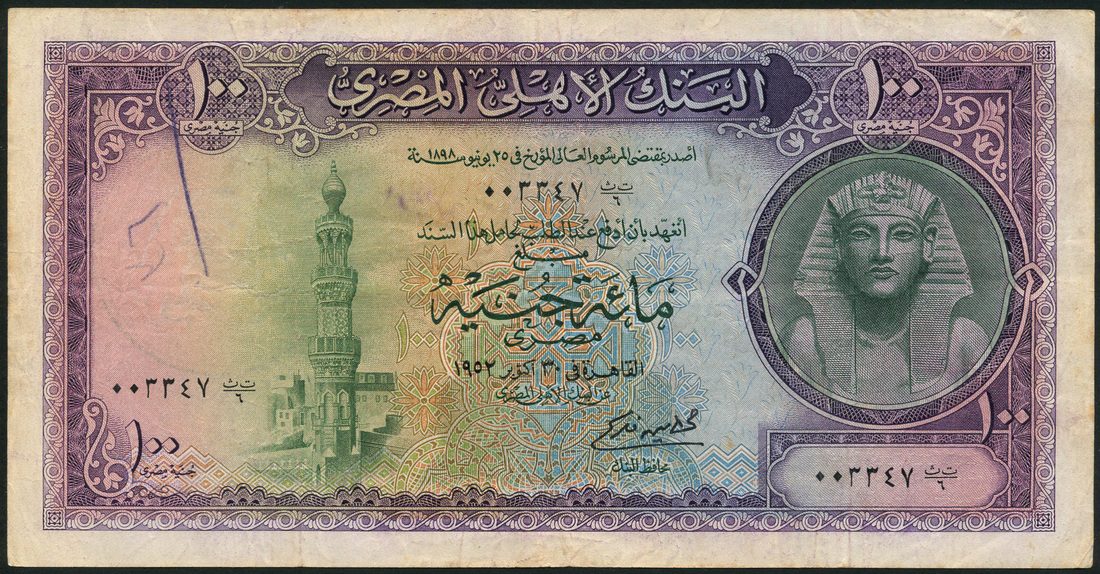 National Bank of Egypt, £100, 1952, serial number 003347, purple on multicolour underprint, King Tutankhamen at right, Fikri signature
