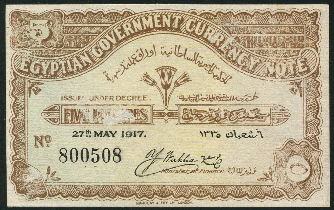 Egyptian Government Currency Note, 5 piastres, 27 May 1917, serial number 800508, brown and pale green, reverse green, ruins of the Temple of Isis, Youssef Wahba signature