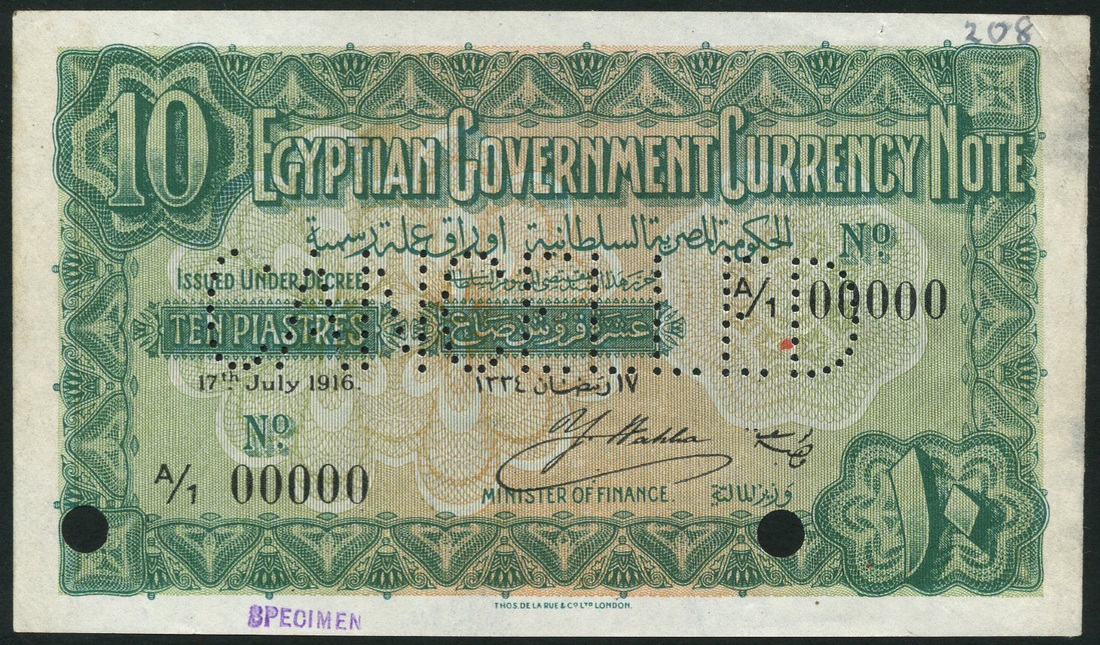 (†) Egyptian Government Currency Note, specimen 10 piastres, 17 July 1916, serial number A/1 00000, green, on orange and green underprint, value at top left and low right, reverse blue, Collossi of Memnon at centre, two cancellation holes, perforated CANCELLED and small purple SPECIMEN handstamp at low left