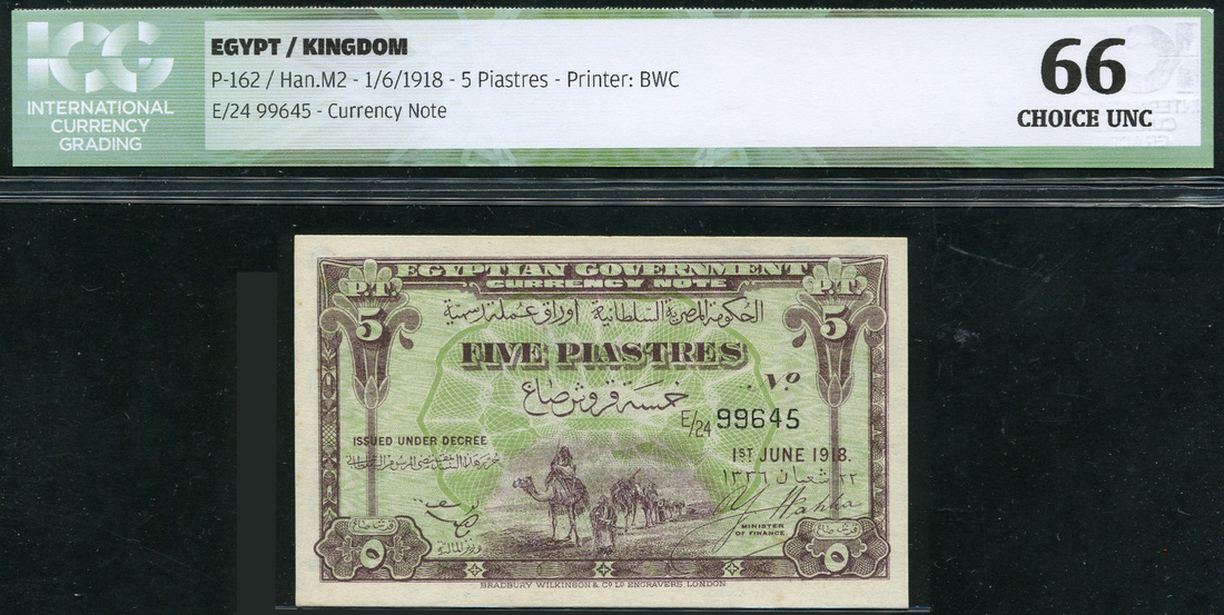 Egyptian Government Currency Note, 5 piastres, 1 June 1918, serial number E/18, 66415, lilac-brown on green underprint, camel train at lower centre, reverse blue, sphinx at left and right Wahba signature