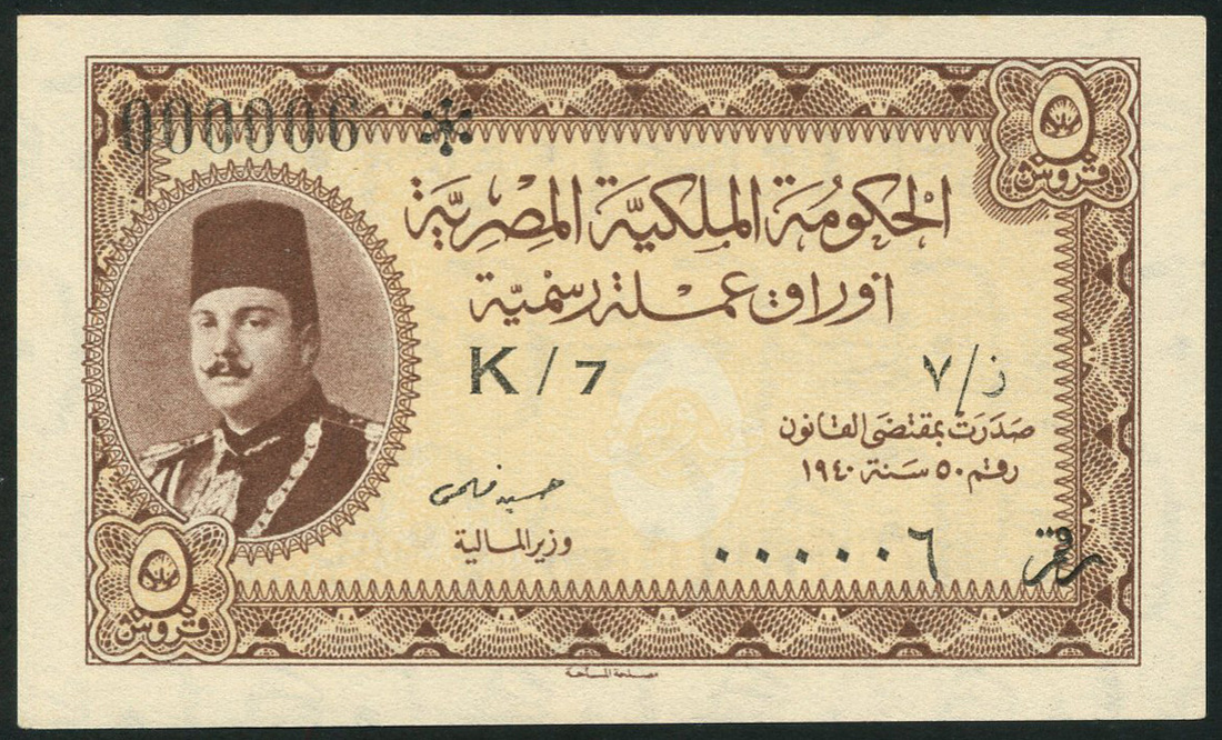 Egyptian Government Currency Note, 5 piastres, ND (1940), serial number K/7 000006, brown on tan underprint, King Farouk at left, value at low left and top right, reverse dark blue on grey