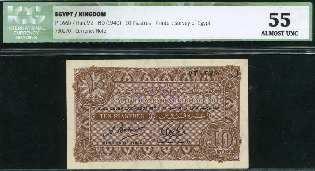 Egyptian Government Currency Note, 10 piastres, 1940, serial number 730270, brown on pink underprint, value at low right and top left, reverse dark blue, view of Cairo with the Citadel at centre, Abdulhamid Badawy signature