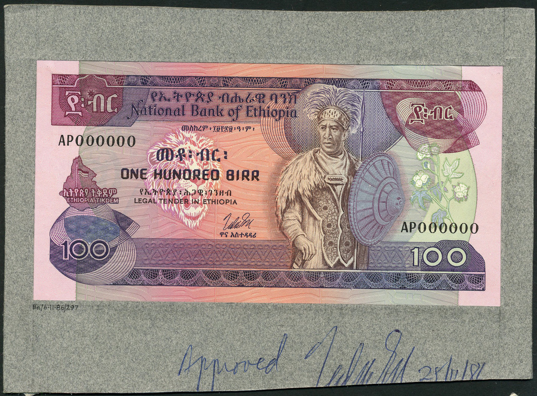 (†) National Bank of Ethiopia, an obverse and reverse printers composite essay for a 100 birr, ND (1986), prefix AP, purple and multicoloured, the Emperor Menelik II at right, cotton plant at right, map at left, reverse violet, monument and scientist with microscope