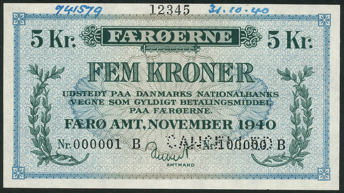 (†) Faeroe Islands World War II, second emergency issue, specimen 1 Krone, serial number 000001A, blue and lilac, 5 Kroner, serial number 000001B, blue and green, both November 1940, wreath at left and right