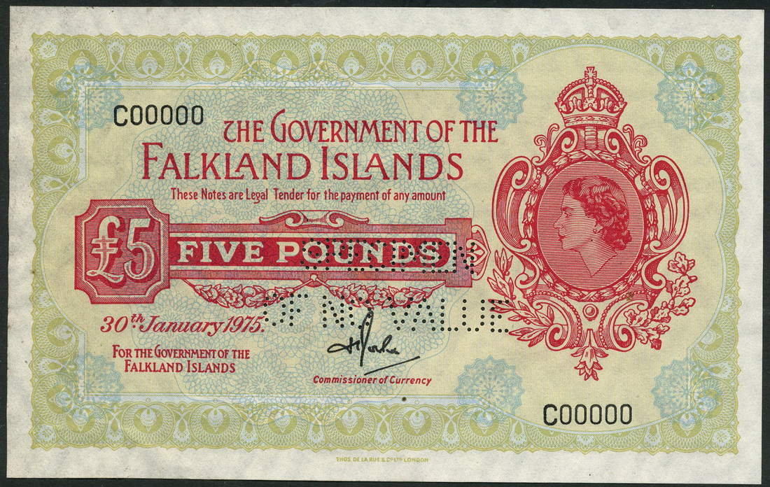 (†) Government of the Falkland Islands, specimen £5, 30 January 1975, serial number C00000, signature Harold Theodore Rowlands, red and green, portrait of Queen Elizabeth II at right, value at left, reverse patterned guilloche, perforated SPECIMEN OF NO VALUE