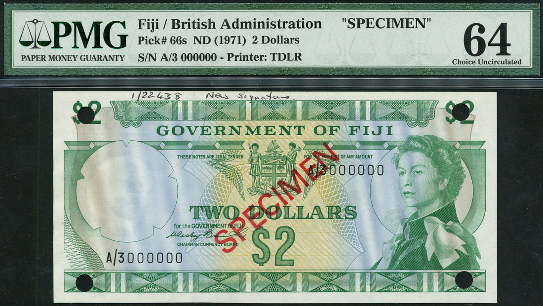Government of Fiji, specimen $2, ND (1971), serial number A/3 000000, green on light blue and yellow, portrait Queen Elizabeth II at right, arms top centre, value top left, right and at centre, reverse, ornate border top and low, value in each corner