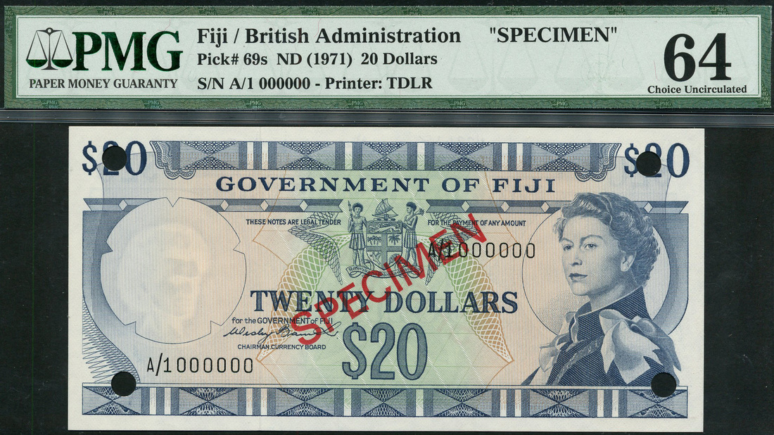 Government of Fiji, specimen $20, ND (1971), serial number A/1 000000, blue on light green and orange, portrait Queen Elizabeth II at right, arms top centre, value top left, right and at centre, reverse, ornate border top and low, value in each corner