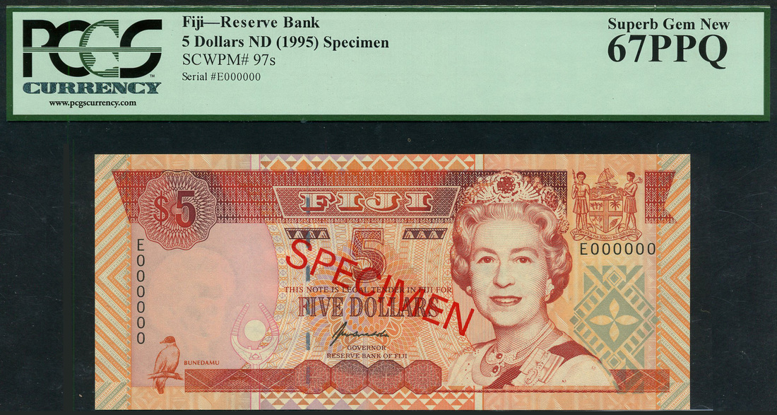 (x) Reserve Bank of Fiji, specimen $5, ND (1995), serial number E000000, orange, coat of arms and Elizabeth Ii at right, reverse orange, Nadi International Airport, red SPECIMEN overprint