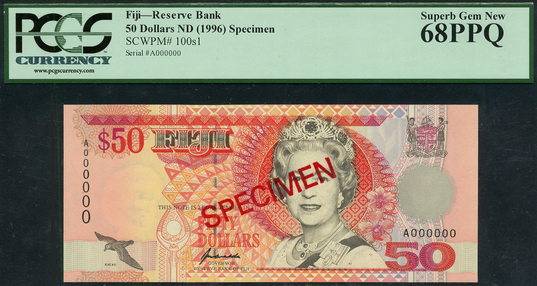 (x) Reserve Bank of Fiji, specimen $50, ND (1996), serial number A000000, orange, coat of arms and Elizabeth II at right, reverse orange, soldier raising flag, red SPECIMEN overprint